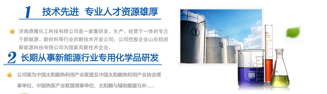 濟(jì)南鼎隆化工科技有限公司是一家集研發(fā)、生產(chǎn)、經(jīng)營于一體的專注于新能源、新材料等行業(yè)的新技術(shù)開發(fā)公司;公司控股企業(yè)山東鉑潤新能源科技有限公司為國家高新技術(shù)企業(yè)。擁有雄厚的科研實(shí)力和專業(yè)銷售隊(duì)伍以及多名從事化學(xué)化工專業(yè)的高素質(zhì)人員,其中博士生導(dǎo)師1人,碩士研究生3人。公司現(xiàn)為中國太陽能熱利用產(chǎn)業(yè)聯(lián)盟及中國太陽能熱利用產(chǎn)業(yè)協(xié)會(huì)理事單位、中國熱泵產(chǎn)業(yè)聯(lián)盟理事單位、山東清潔能源供暖產(chǎn)業(yè)聯(lián)盟理事單位、太陽能與輔助能源互補(bǔ)供熱/制冷工程專業(yè)委員會(huì)會(huì)員單位。公司專注于綠色科技,專業(yè)化研發(fā)環(huán)境友好型化工產(chǎn)品,與眾多高校和國內(nèi)外多家著名化學(xué)品公司保持戰(zhàn)略合作關(guān)系。公司擁有“載能”和“澤能”...更多